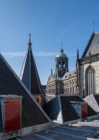 Dit werk toont het Paleis op de Dam in Amsterdam, gezien vanaf een unieke plek, namelijk het dak van de Nieuwe kerk. Te zien zijn de torentjes met kleine rood geverfde deurtjes van de Nieuwe Kerk en een gedeelte van een zijbeuk. Daarachter doemt het Paleis op met zijn karakteristieke ronde open toren met groen uitgeslagen koperbeslag.…