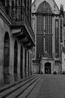 De voorkant van het paleis op de Dam met op de achtergrond de Nieuwe kerk. De traptreden geven een fraai lijnenspel aan dit werk.