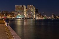 Deze avondfoto van het Paleis van Justitie is genomen aan de achterzijde van Centraal Station Amsterdam. Het gebouw is gelegen aan het IJdock, aan het IJ.