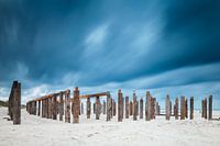De houten palen op het strand van Terschelling en een donkere lucht die voorbij komt, door de lange sluitertijd.