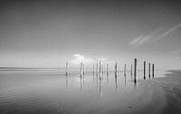 Palen op het strand van het Waddeneiland Schiermonnikoog in de winter. Het strand is verlaten tijdens deze winderige dag terwijl de zon afgewisseld wordt met buien. De zee is vlak door het gebruik van een lange sluitertijd voor deze zwart wit opname.