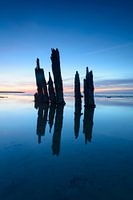 Oude landaanwinnings palen op het wad bij Paesens-Moddergat in Friesland aan het eind van de dag tijdens zonsdondergang.