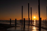 De zon gaat onder tussen de palen in de zee. De schommel hangt er rustig bij.