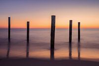 Zonsondergang bij Palendorp Petten. Dit palendorp staat op het strand in Petten en is een mooi kunstwerk bestaande uit 160 palen van 6m tot 12m hoog. De palen staan in de vorm van 10 huizen en een kerk. Het is een herinnering aan het lang geleden door zee overspoelde oude Petten.