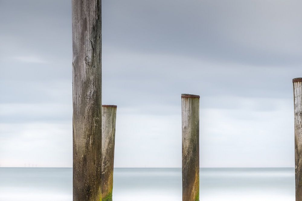 Op deze foto zien we de karakteristieke houten palen van het Palendorp in Petten, die ritmisch uit de zee omhoogrijzen. De palen staan stil en krachtig, terwijl het water door de long exposure zijdezacht en bijna dromerig oogt. De groene aanslag aan de onderzijde van het hout verraadt de voortdurende strijd tussen eb en vloed, tussen beweging en stilstand.