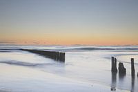 Het strand hier op het uiterste Westelijke puntje van het eiland achter het Hollumerbos wordt sinds jaar en dag beschermd tegen de sterke afslijting door de diepe geul en getijdenstroom door de rijen met houten palen.
