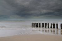Het strand hier op het uiterste Westelijke puntje van het eiland achter het Hollumerbos wordt sinds jaar en dag beschermd tegen de sterke afslijting door de diepe geul en getijdenstroom door de rijen met houten palen.