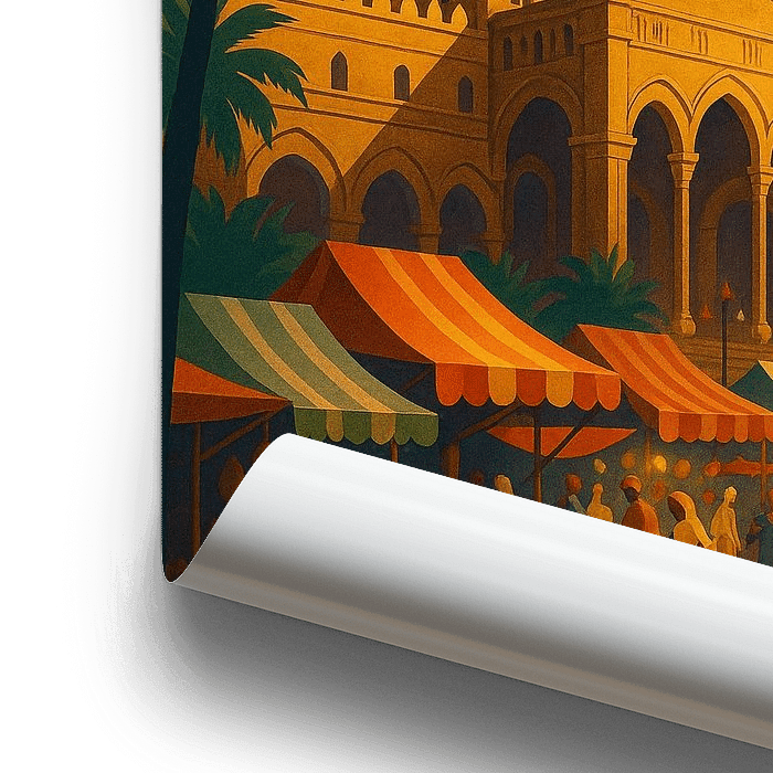Deze Palermo Art Deco poster straalt het unieke karakter uit van de levendige hoofdstad van Sicilië. Het kunstwerk benadrukt de prachtige kathedraal van Palermo met zijn kenmerkende koepels, bogen en middeleeuwse details, afgezet tegen een levendig markttafereel vol kleurrijke tenten. Zonnestralen omlijsten de architectuur en roepen de warmte van mediterrane avonden en het bruisende leven van Siciliaanse straten op. Deze print is ontworpen in een vintage art-decostijl en combineert gedurfde vormen, warme tinten en nostalgische charme om de essentie van Palermo vast te leggen. Palermo, bekend om zijn rijke geschiedenis, Arabisch-Normandische architectuur en dynamische cultuur, is een kruispunt van beschavingen waar traditie en energie elkaar ontmoeten. Deze muurkunst kanaliseert die geest en maakt er een tijdloos decorstuk van. Perfect voor liefhebbers van Italië, verzamelaars van reisposters of iedereen die op zoek is naar een vleugje mediterrane sfeer in huis. Dit Palermo kunstwerk brengt geschiedenis, elegantie en Siciliaanse ziel in elke ruimte.