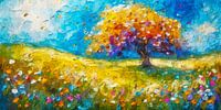 'Palet van de Natuur' is een explosie van kleur en leven, een schilderij dat het oog vangt en de ziel raakt. Dit werk is een levendige viering van de natuur en haar ongeëvenaarde schoonheid door de seizoenen heen. De textuur en het kleurgebruik brengen een boom in volle bloei tot leven, omringd door een veld van wilde bloemen onder een hemel van helderblauw.