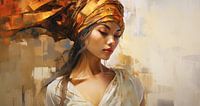 Dit digitale kunstwerk straalt een subtiele kracht uit, gevangen in de serene blik van een vrouw gehuld in gouden doeken. Haar gesloten ogen en de zachte curve van haar lippen suggereren een innerlijke rust en zelfverzekerdheid die de kijker intrigeert. De achtergrond vloeit in abstracte vormen en kleuren, die de compositie een impressionistische sfeer geven, terwijl de scherpe lijnen en gedetailleerde texturen in haar kleding en hoofddeksel een modern contrast bieden. De digitale penseelstreken zijn zorgvuldig geplaatst, wat zorgt voor een rijke interlinie en diepte, en weerspiegelen het vakmanschap achter dit moderne portret.