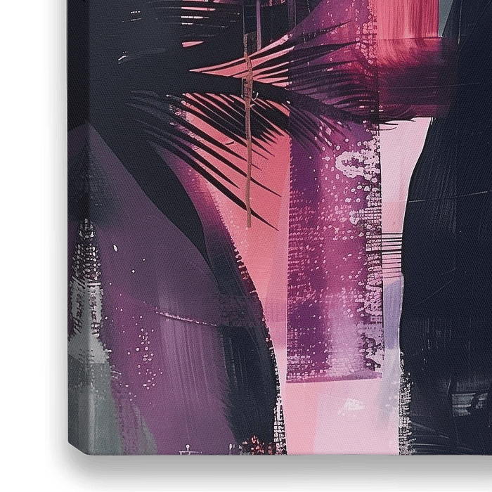 'Palm Beach' is een abstract kunstwerk dat de sfeer van een tropisch paradijs vastlegt met grafische vormen en een warm kleurenpalet. De stroken mix van donkerblauw en paars, creëert een gevoel van diepte en mysterie. De rijke tinten worden in balans gebracht door de zachtere lila en perzikkleurige accenten met hier en daar een iets…