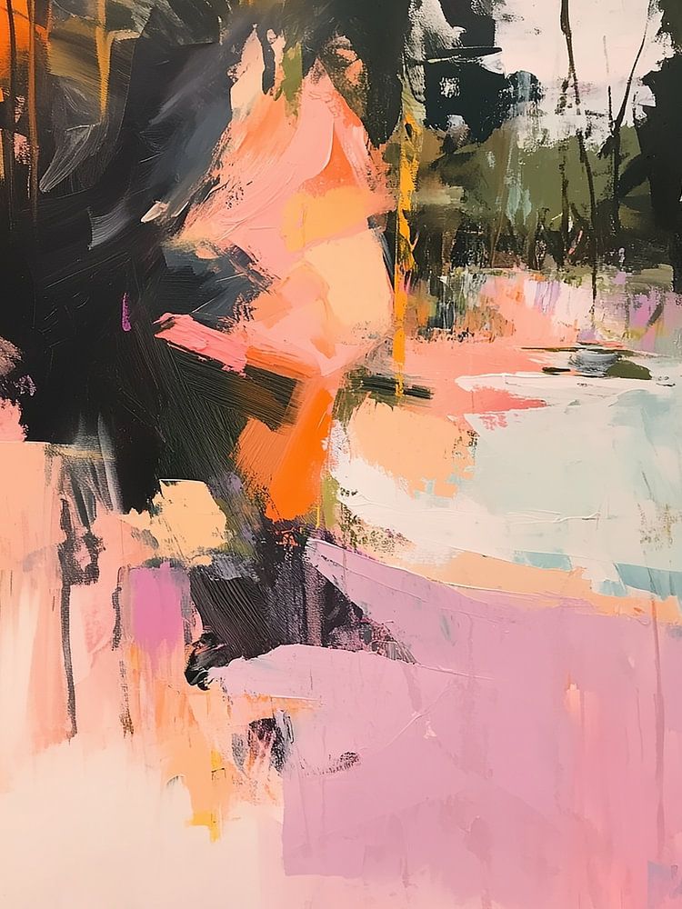 Palm Beach is een dromerige verkenning van herinnering, vakantiegevoel en het vervagen van tijd in kleur. In deze abstract-expressionistische compositie worden tropische elementen – zoals palmbomen en een mogelijk kustlandschap – niet letterlijk weergegeven, maar ondergedompeld in een zachte, bijna suikerachtige wereld van pasteltinten.