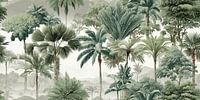 Droomachtig botanisch behang met tropische planten in zachte groentinten, ideaal voor een serene en natuurlijke interieurstijl