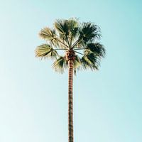 Een majestueus oriëntatiepunt van de zon rijst hoog op in de helderblauwe lucht. De fijne, waaiervormige bladeren wiegen zachtjes in de wind, terwijl de slanke stam fier omhoog steekt. Rust en tropische flair komen hier samen en het idee van zomer en vakantie zweeft door de lucht terwijl de tijd lijkt stil te staan.