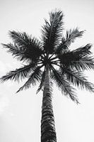Het delicate gebladerte van een majestueuze palmboom ontvouwt zich op grote hoogte en reikt als een natuurlijke parasol naar de hemel. De monochrome afbeelding benadrukt de sierlijkheid van de gebogen takken en dompelt de kijker onder in een rustige tropische wereld waarin tijd en ruimte vervagen. Een adembenemend perspectief dat de schoonheid van de natuur viert.