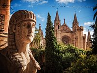 Eine Impression aus Palma de Mallorca: Die Sphinx am Passeig des Born mit der Kathedrale im Hintergrund.