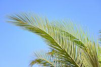 Koop de foto Palmbladeren tegen een blauwe lucht van Ulrike Leone op canvas, aluminium dibond, (ingelijste) fotoprint, behang en ArtFrame, op maat geprint in Fine-Art kwaliteit.