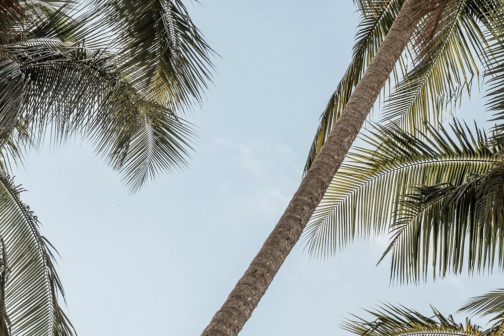 Deze rustgevende foto toont hoge palmbomen die zachtjes wuiven tegen een heldere, tropische lucht. De elegante lijnen van de stammen en de speelse schaduwen van de bladeren creëren een dynamisch maar harmonisch beeld. De subtiele zonnestralen die door het bladerdak schijnen, voegen een warme en exotische sfeer toe, perfect voor liefhebbers van tropische natuur en ontspannende kustlandschappen.