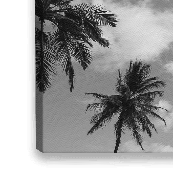 Zwart wit foto van een palmboom aan het strand op het eiland Bali. Simplistische foto van een enkele palmboom met kokosnoten. Sterk contrast met de witte wolken en felle zon.