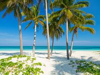 Deze foto is gemaakt op het prachtige witte zandstrand van Cayo Levisa, een klein eiland in het westen van Cuba. Dit tropische paradijs in de turquoise Caribische zee is omzoomd met palmbomen en prachtige riffen.