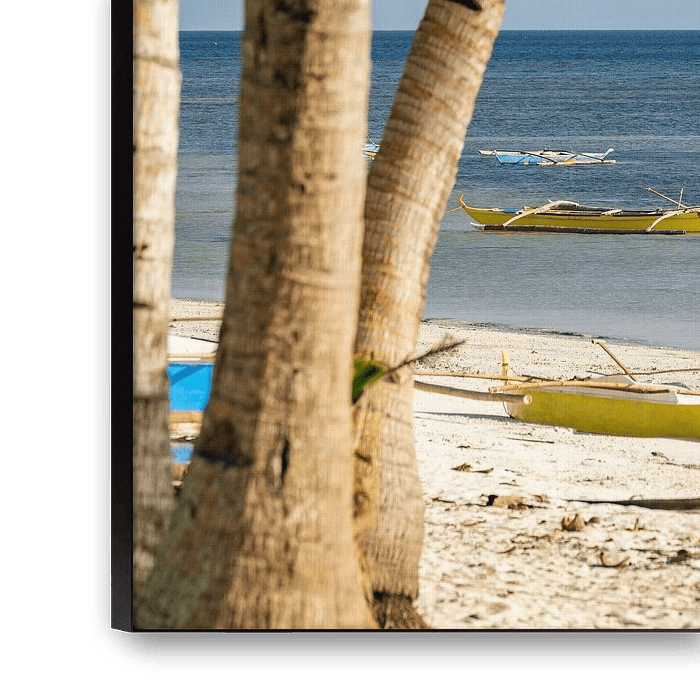 Palmbomen en zee met Bangka boot voor zonsondergang op Siquijor eiland in de Filippijnen