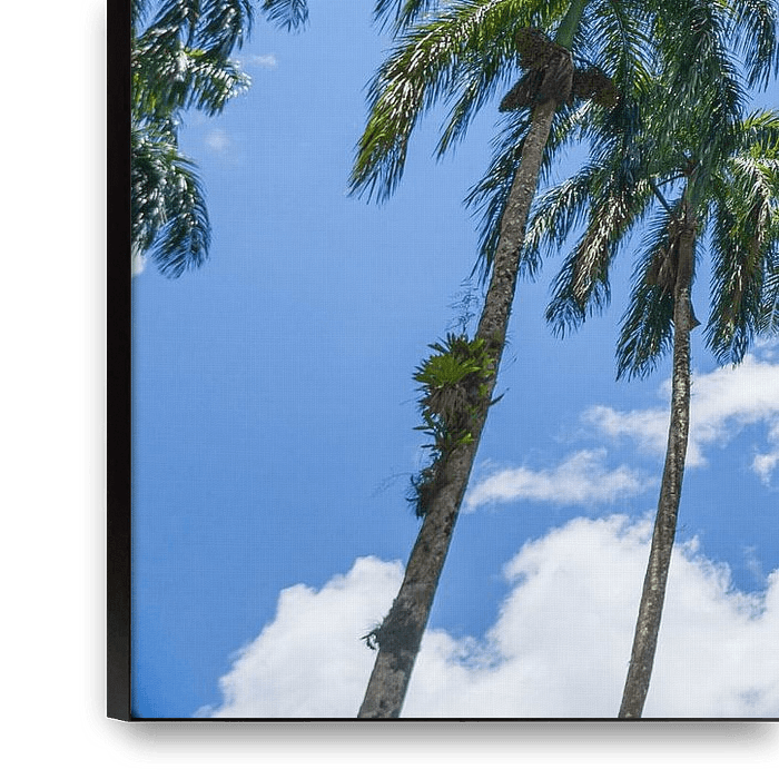 Palmbomen tegen een blauwe lucht in de Palmentuin in de hoofdstad van Suriname, Paramaribo
