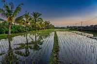 Bij ondergaande zon weerspiegelen de palmbomen in het water van een rijstveld op Bali.