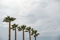 Op de foto zie je een rijtje van vijf palmbomen. De bovenkant van de palmbomen is duidelijk zichtbaar tegen de achtergrond van een bewolkte lentelucht. Deze palmbomen staan op een strand in Italië. De bladeren van de palmbomen waaien lichtjes in de wind, wat een rustgevend en natuurlijk beeld creëert.