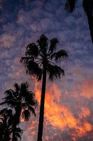 Palmbomen op het Spaanse eiland Mallorca tijdens zonsondergang. De kleuren waren heel dramatisch en fel, wat mooi tegen de silhouetten van de palmbomen stak.