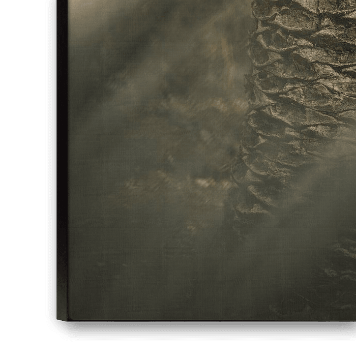 De robuuste stam van een palmboom baadt in zacht gefilterd zonlicht, waardoor de diepe textuur van de schors extra tot leven komt. De fijne lichtstralen die door het bladerdek vallen creëren een dromerig en bijna mystiek effect, waarin natuur en licht subtiel samensmelten. Dit kunstwerk vangt niet alleen de fysieke structuur van de boom, maar ook de sfeer van een rustig, tropisch moment in de natuur. Een ideale toevoeging aan natuurlijke of meditatieve interieursettings die textuur en warmte omarmen.