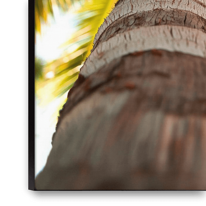 Een majestueuze palmstam rijst op naar de hemel en opent een blik op een gloeiend geheel van frisse, groene bladeren. De in elkaar gevlochten stroken schors vertellen verhalen van zon en wind, terwijl het spel van licht en schaduw een vredige sfeer creëert. Natuur en rust komen hier in perfecte harmonie samen.
