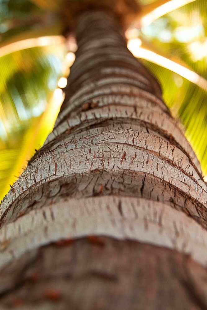 Een majestueuze palmstam rijst op naar de hemel en opent een blik op een gloeiend geheel van frisse, groene bladeren. De in elkaar gevlochten stroken schors vertellen verhalen van zon en wind, terwijl het spel van licht en schaduw een vredige sfeer creëert. Natuur en rust komen hier in perfecte harmonie samen.