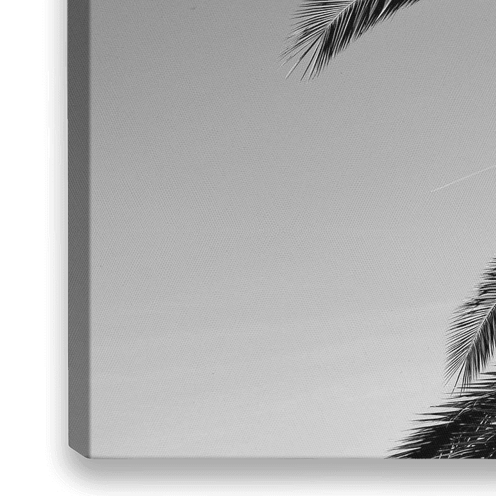 Prachtige afbeelding van een grote palmboom. Close up in zwart wit. Grote bladeren met vruchten aan de boom.