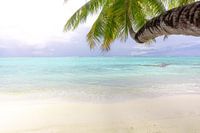 Kokospalm op het strand van de Malediven boven het water van de Indische Oceaan.