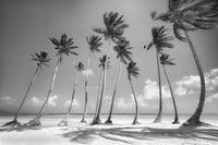 Een paradijselijk strand met hoge kokospalmen en een wit zandstrand aan zee in het Caribisch gebied.