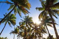 Prachtige zomerse opname van de zon die door de bladeren van palmbomen schijnt op het tropische eiland Madagaskar, een paradijs in de Indische oceaan ten oosten van Afrika