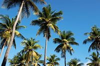 Tropische palmen op het eiland Mustique steken zomers af tegen de blauwe lucht voor een super vakantie gevoel