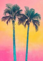 Palmbomen, twee palmbomen, retrostijl poster, roze en gele hemelachtergrond, turquoise palmsilhouetten, zomervibes, vintage, jaren 80 vibe, popartstijl, kleurrijk, pastelkleuren, print op papier, geen tekst, geen woorden, geen cijfers, geen typografie, geen gezichten, geen handen, geen vingers, geen schaduwen, geen zwarte rand, geen…