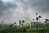 Deze foto toont een dichte tros van de typische waspalmen in de Cocoravallei. De mist hangt laag over de heuvels en creëert een bijna surrealistische sfeer. De lange, slanke palmen vormen verticale lijnen die sterk afsteken tegen de zachte heuvels.
