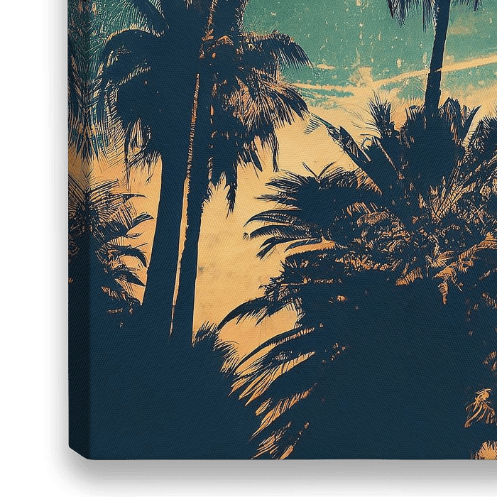 Prachtige afbeelding van tropische palmbomen in de zon. Contrasterend kleurgebruik in petrol, beige, zwart en bruin. Passend bij diverse stijlen en trends.
