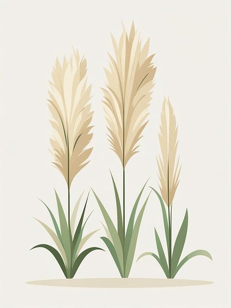 Een elegante illustratie van drie pampasgraspluimen met vederlichte crèmekleurige zaadhoofden die oprijzen uit slanke groene stengels en bladachtig gebladerte. Het zachte, neutrale palet en de luchtige textuur doen denken aan kust- en bohemienesthetiek. Ideaal voor bruiloftdecoraties, boho-chique ontwerpen, droogbloemarrangementen,…