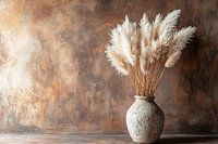 Dit prachtige ontwerp straalt rust en eenvoud uit met zijn aardse kleuren en natuurlijke materialen. Een rustieke stenen vaas, gevuld met zachte pluimen van pampasgras, vormt het middelpunt van deze compositie. De warme tinten in de achtergrond zorgen voor een harmonieuze sfeer en maken dit een perfecte keuze voor liefhebbers van minimalistisch en tijdloos design. Ideaal om een vleugje natuur toe te voegen aan uw interieur, of het nu in de woonkamer, hal of slaapkamer is. Het ontwerp past bij moderne, klassieke en Japandi-stijlen en creëert een rustige ambiance in elke ruimte. Een subtiele blikvanger voor ieder interieur!