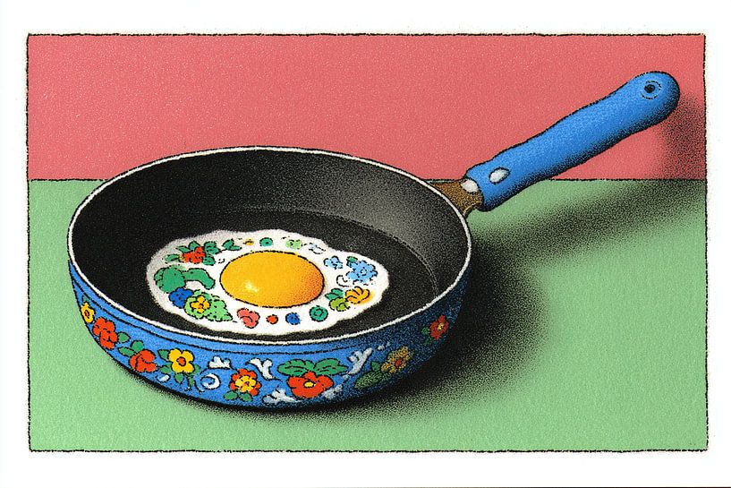 Details: pan, ei, bloemen, keuken, kleurrijk, groen, blauw, geel, vrolijk,…