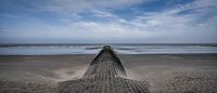 Een imposante golfbreker op het strand van Oostende aan de Belgische kust bij laag water . De Noordzee ligt er rustig bij , een mooie licht bewolkte blauwe lucht draagt de belofte van een mooie dag met zich mee .