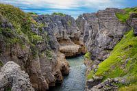 Pancake rocks, Nieuw Zeeland. De toeristische trekpleister van de westkust zijn de Pancake rocks, gelaagde rotsen in een indrukwekkend landschap. In de buurt van het kleine kustplaatsje Punakaiki.