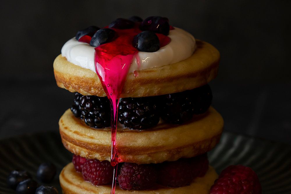 taartje in lagen met fruit. Donkere achtergrond. taartje van american pancakes, room, fruit en siroop