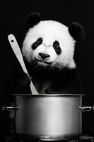 Een charmant, speels wezen geeft de indruk dat het met liefde een culinair meesterwerk tevoorschijn tovert. Het contrast tussen het pluizige zwart-wit van de panda en het glanzende metaal van de steelpan zorgt voor een humoristisch accent. Ideaal voor in de keuken om warmte en plezier te verspreiden tijdens het koken!