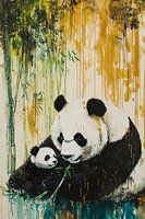 Een prachtig schilderij van een liefdevolle panda en haar jong, omringd door een sfeervol bamboebos. Het ontwerp combineert een artistieke expressieve stijl met warme tinten, perfect om een unieke sfeer in je interieur te creëren. Ideaal voor natuurliefhebbers of als een kalmerend middelpunt in elke ruimte.