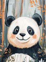 Panda - Op dit schilderij zie je een schattige panda met grote ogen, omringd door een rustige bosachtige achtergrond met oranje bladeren, wat het geheel een vrolijke uitstraling geeft.