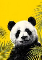 De afbeelding toont een charmante pandabeer die nieuwsgierig tussen tropische palmbladeren vandaan tuurt. De achtergrond in helder geel zorgt voor een stralend, modern accent dat het zwart-wit contrast van de panda op indrukwekkende wijze benadrukt. De duidelijke lijnen en aandacht voor detail van de vacht geven het motief een realistische diepte, terwijl de levendige kleurkeuze het er tegelijkertijd speels laat uitzien.